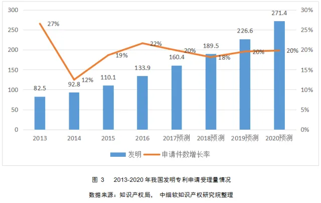 预计2017年发明专利申请总量将在160.4万件,同比增长20%;预计2020年全国专利申请总量将在271.4万件,同比增长20%。参见下表及图: