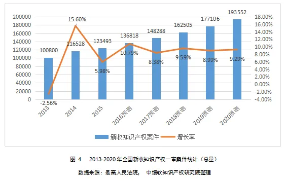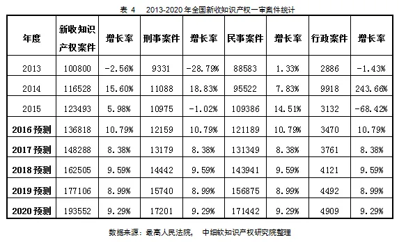 据最高人民法院数据显示,2013年-2015年,全国新收知识产权一审案件从10万件增长到12.34万件,预测2017年将达到14.8万件,增长率8.38%;到2020年,进一步上升到19.3万件,增长率9.29%。参见下表及图: