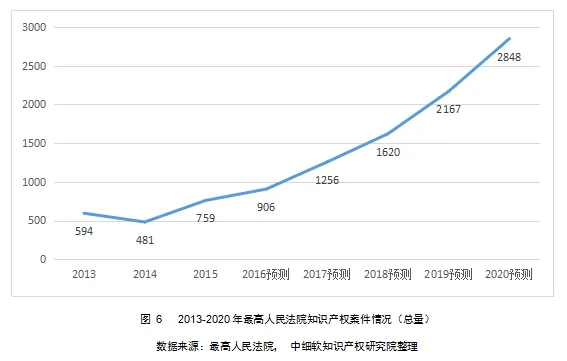 据中国法院网统计,2013年-2015年,最高人民法院知识产权审判庭全年共新收各类知识产权案件从594件增至759件,2015年增幅较大,同比增长58%。