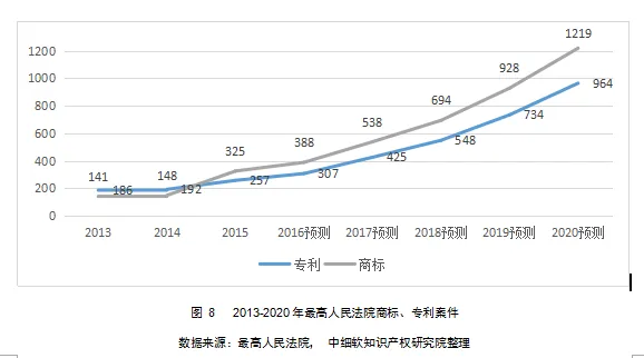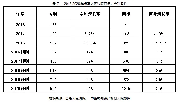 其中,预测专利类案件在2017年将达到425件,到2020年将达到964件;商标类案件在2017年将达到538件,到2020年将达到1219件。参见下表及图: