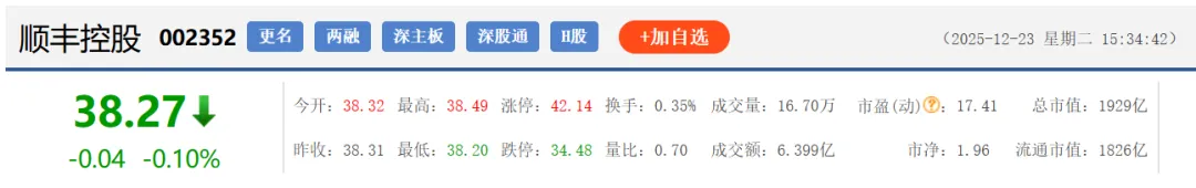 12月23日顺丰A股行情: