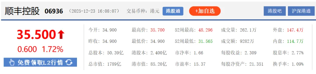12月23日顺丰港股行情: