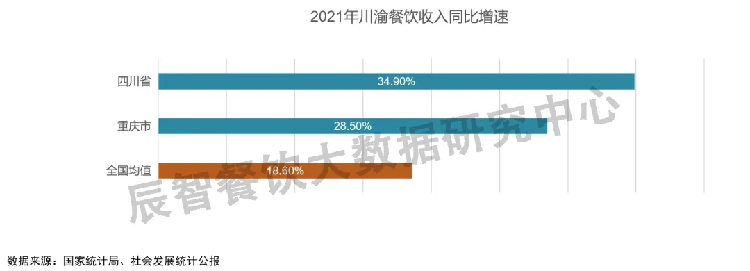 2021全国餐饮同比增长18.6%,四川省餐饮收入3349.6亿元,增长34.9%,重庆市餐饮收入1953.3亿元,增长28.5%,四川省与重庆市餐饮收入业同比增速高于全国水平。
