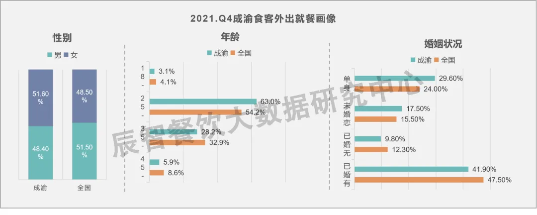 相较全国,成渝地区47.1%的消费者是未婚人群,66.1%的消费者是35岁以下青年群体,未婚、女性和青年外出就餐活跃度都高于全国平均水平。