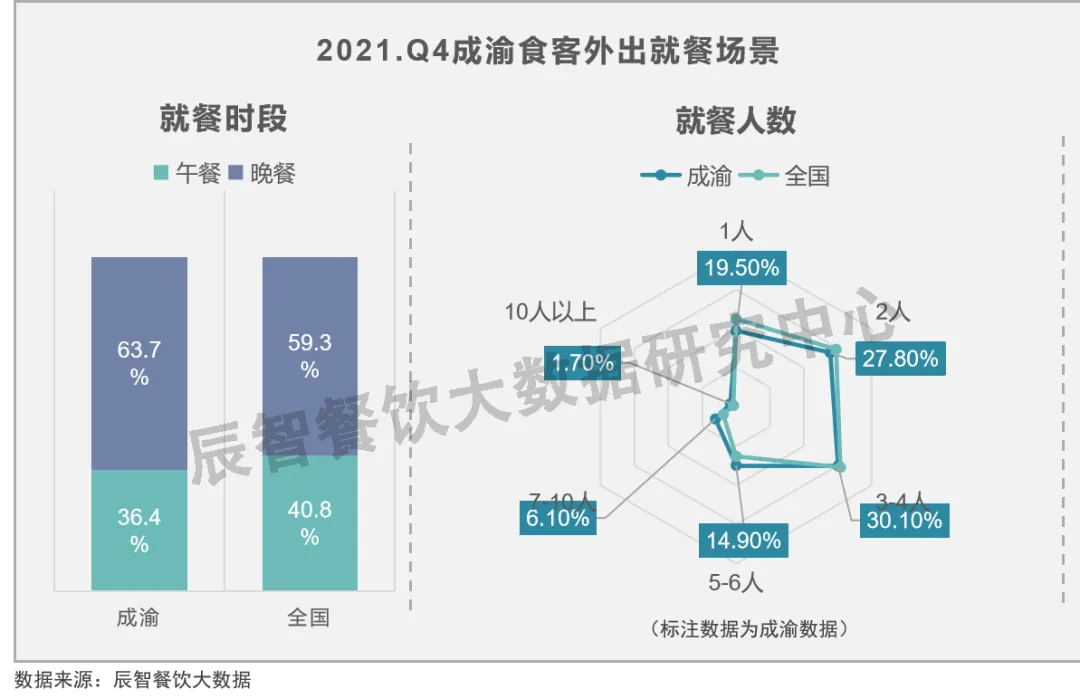另外,川渝的夜经济也非常繁荣,就餐时段中晚餐占比63.7%,晚上外出就餐比例高于全国。