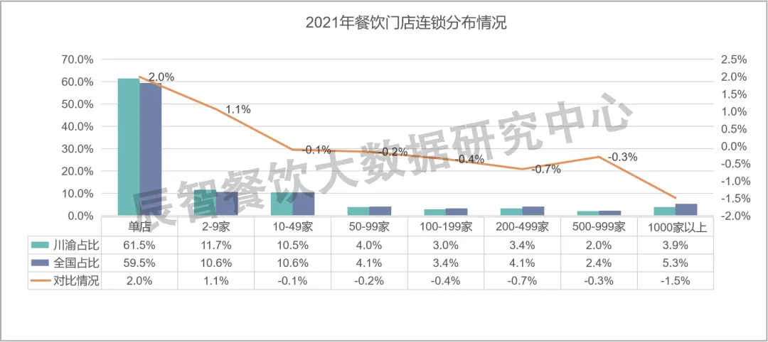目前61.5%的川渝餐饮还是单店经营,而100家店以上的品牌连锁店占比只有12.3%,川渝的连锁率低于全国水平,本地餐饮企业还有很大的进步空间。