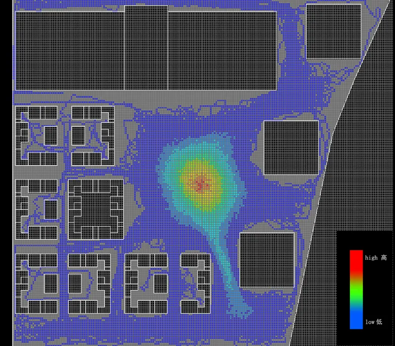 以某社区型集散广场的人流拉拽力测试为例,图右下角为地铁口(即人流释放点),可以看出行人对于开放空间拥有天然的趋向性。这种趋向性带来的高可达性与高驻留性,要远远高于街铺等纯交通性空间。