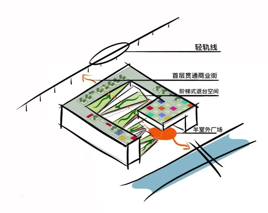 东北侧鸟瞰图,呈现出异于一般城市中心区域高密度商业的特征