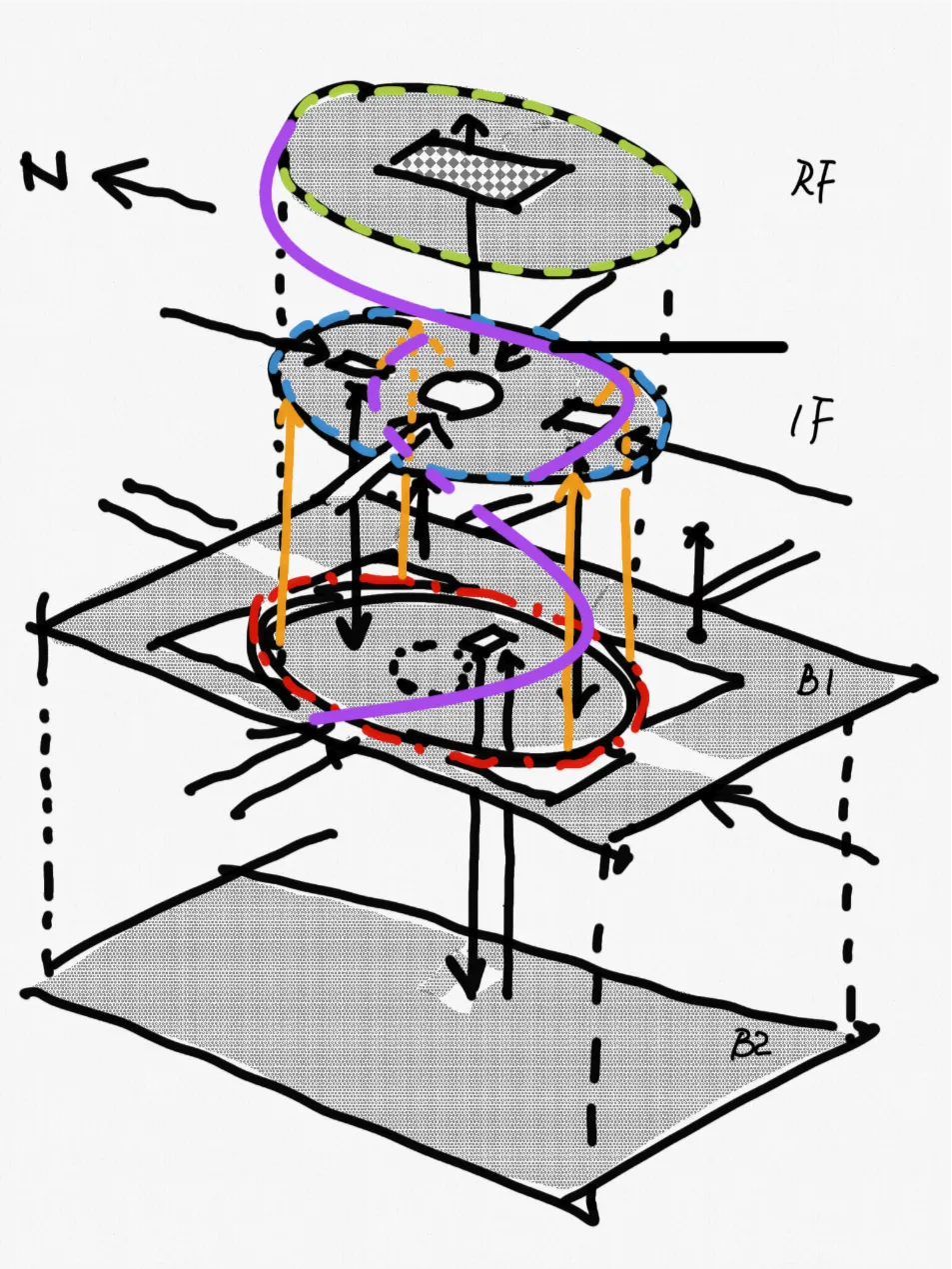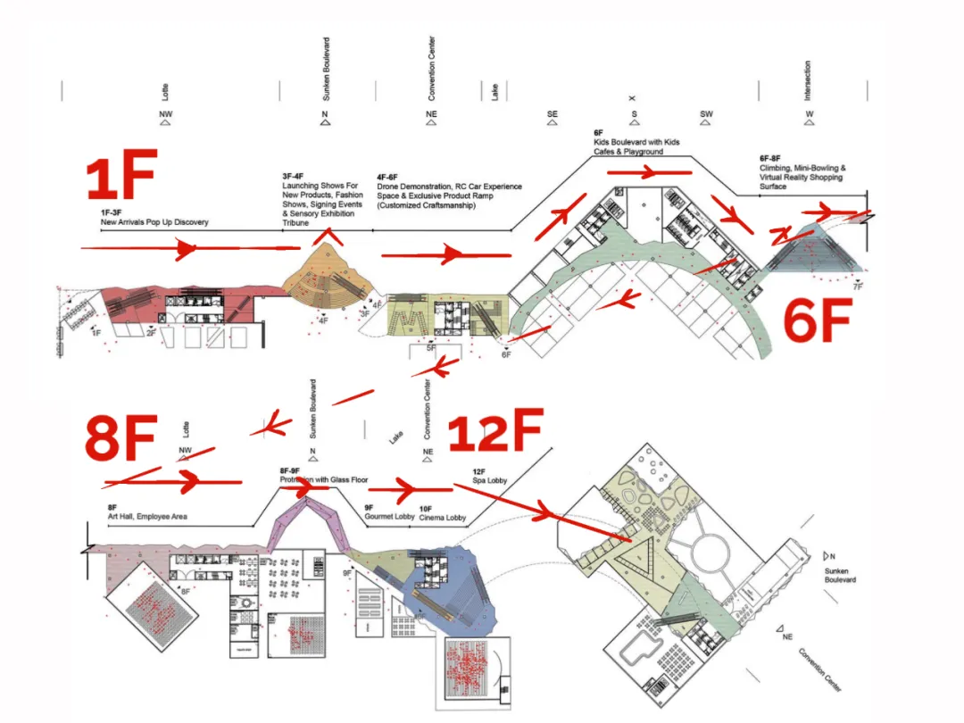 拆解 galleria gwanggyo 的各层外部游逛动线后,我们可以看到其动线将内部功能串联在一起,形成了带有剧情的空间。