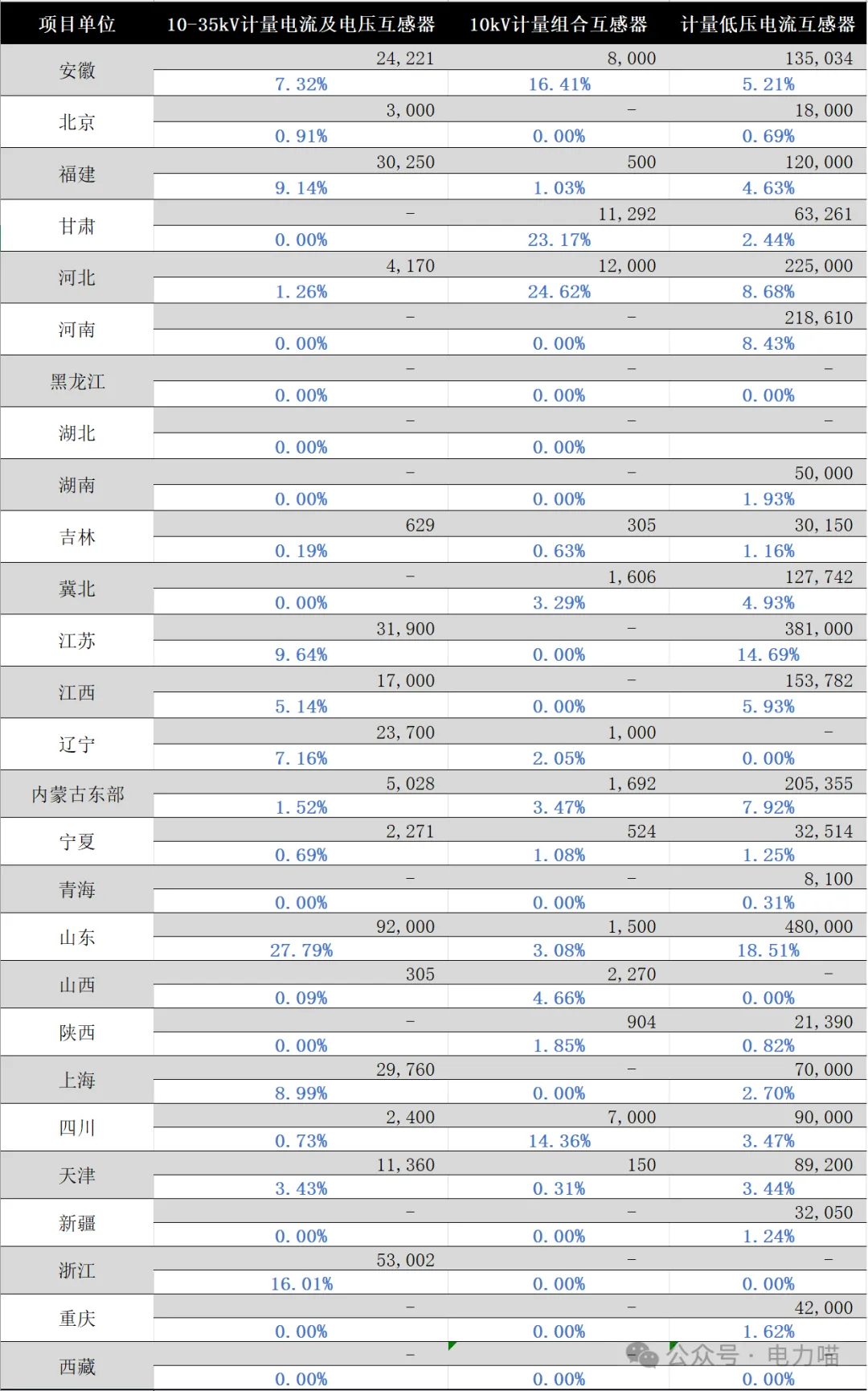计量低压电流互感器需求主要来源于安徽、河北、河南、江苏、江西、蒙东和山东(占比超过5%),合计占69.37%。