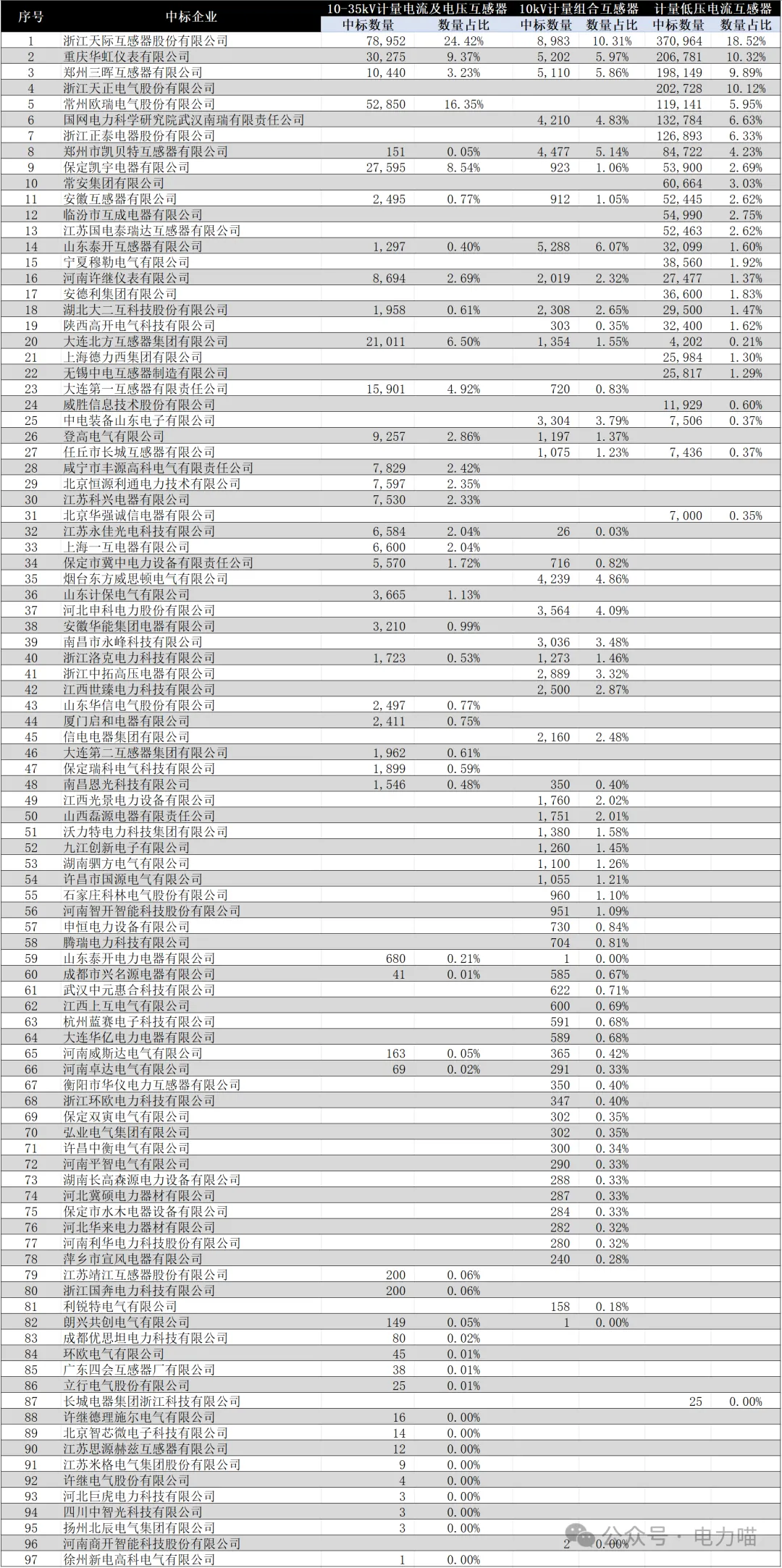 综合2023年度各省的计量互感器产品招标数据,共有97家企业有相关产品的中标记录。