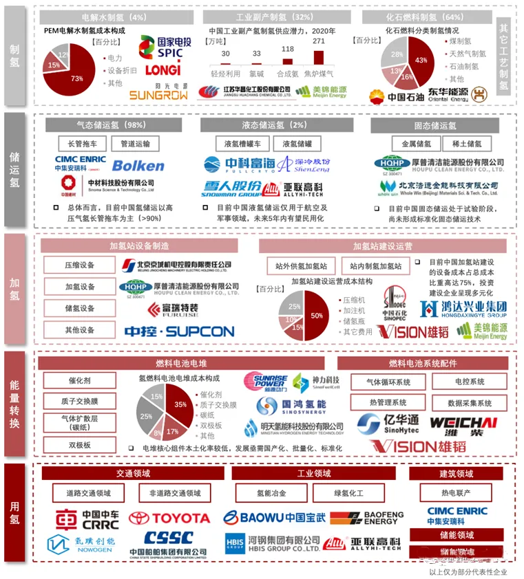 在清洁能源领域,水电起步最早,风电、光电近年直追。不过,受自然条件约束,三者的供电量并不均衡,地域分布也不均衡。同时,国内光电、风电多产自资源丰富的中西部,需要以特高压的方式输送到缺电的长三角、珠三角等地,抬升了成本。电力结构性供需失衡,已成为经济高质量发展中的难题,“西电东输”、“东数西算”工程都是电力再平衡的过渡策略。而氢能被认为是长周期、大规模储能的主流方式。光伏和风能基地可以利用“弃电”电解水制氢,保存冗余电力,需要时再把氢气转化为电能。其中,电解水制氢的过程是,在充满电解液的电解槽中通入直流电,水分子会在电极上发生电化学反应,分解成氢气和氧气。而氢气转化为电能,则是电解水制氢的逆反应,即氢气与氧气(或空气)在燃料电池系统中发生非燃烧的电化学反应,生成水并释放出电能。所以,电氢转换的核心技术,在于燃料电池、电解槽两大部件,这也是当前中国氢能产业“卡脖子”所在。中国氢能产业链分为制氢、储运氢、加氢、能量转换(燃料电池)、用氢。制氢环节是产业链中非常重要的一环。根据制备过程中碳排放程度的不同,制氢环节产生的氢气可划分为灰氢、蓝氢和绿氢。其中,通过化石燃料(天然气、煤等制氢)或工业副产(焦炉气或氯碱制氢)生产的氢气,由于制氢过程中碳排放较高,因此被称为灰氢。灰氢制氢由于技术成熟,成本较低,是当前主流制氢手段。在灰氢基础上应用CCUS技术(碳捕捉、碳封存等)大幅降低碳排放或实现零排放,由此方式制得的氢气称为蓝氢。不过该过程仍以化石燃料为原料,且CCUS技术成本相对较高,较难大规模应用。通过可再生能源电解水制得的氢气,由于过程无碳排放,因此被称为绿氢。电解水制氢技术通常分为四种:碱性电解水技术(ALK)、质子交换膜电解水技术(PEM)、高温固体氧化物电解水技术(SOEC)和固体聚合物阴离子交换膜电解水技术(AEM)。其中,SOEC和AEM还处在研发示范阶段,暂未实现商业化应用。而ALK技术已完成商业化进程,有一定成本优势,是目前主要的电解制氢方式。PEM技术处于商业化初期,目前PEM电解槽成本依旧较高,且其核心零部件质子交换膜极度依赖进口,不过PEM具备效率高、能耗少、响应快、负载高等特点,结合未来产业链国产化带来成本下降,PEM将是未来电解制氢的主流方向。根据氢的存在形态不同,储存主要也分为三种方式,分别为气态储氢、液态储氢和固态储氢。气态储存是目前最为常见的储存方式,具有成本低、充放速度快、能耗低、可在常温操作等优点,但缺点也很明显,气态氢密度低,