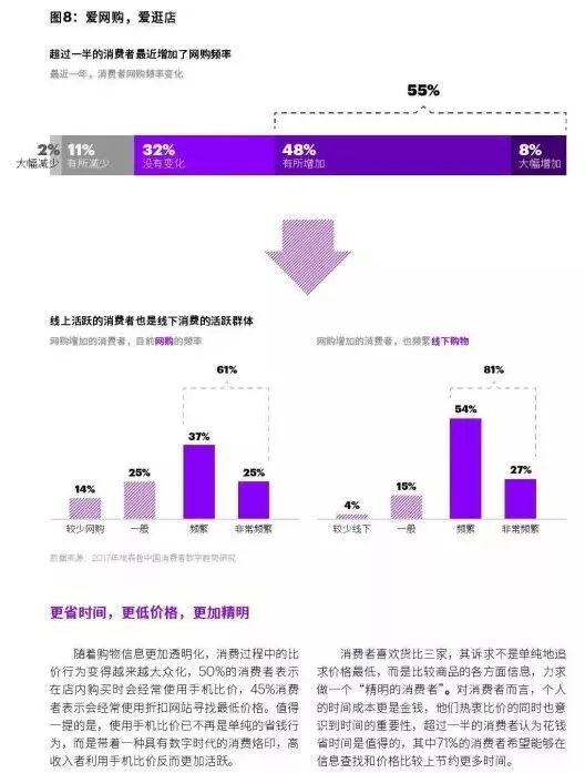 埃森哲的调研发现,55%的消费者最近增加了网购频率,但这部分活跃消费者同时也是线下消费的活跃群体。这些人常会在线下店用手机搜索线上信息,但不再是追求更低的价格,而是会比较商品的各方面信息,做一个“精明的消费者”。