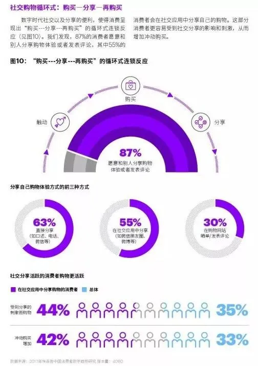 87%的消费者愿意和别人分享购物体验或者发表评论,其中55%的消费者会在社交应用中分享自己的购物。这部分消费者更容易受到社交分享的影响和刺激,从而增加冲动购买,使消费呈现出“购买—分享—再购买”的循环式连锁反应。