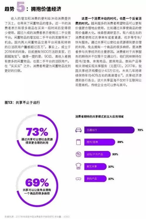 因而,有越来越多消费者希望物品可以更有价值更合理地去使用,比如将闲置通过二手交易平台再次流通(埃森哲的调研显示,已有超六成消费者使用过二手交易平台。2016年成立的咸鱼,目前拥有1600万活跃卖家,已超越淘宝),以及通过共享而不是购买的方式消费商品,这种共享需求最强烈的商品包括图书/音像、体育用品、厨房用品、数码产品等。