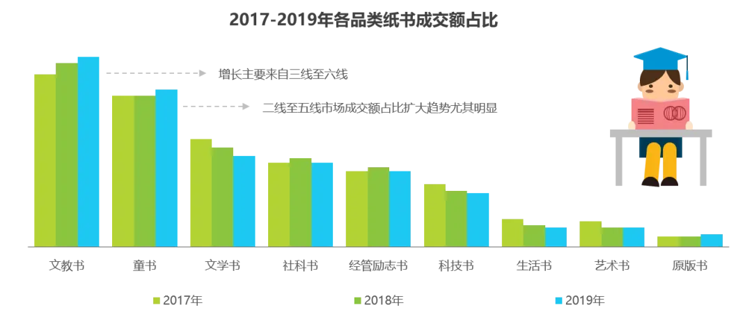 从品类来看,近三年文教书、童书和文学书三种图书类型稳居成交额前三。