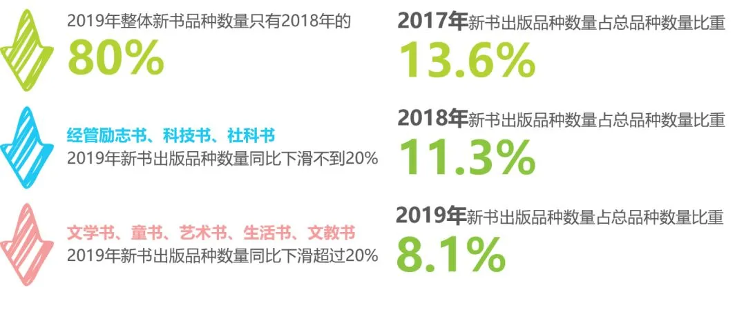 报告显示,2017年中国图书出版种数(包括新版图书和当年重印图书)突破50万种,2018年达51.9万种,同比增长1.3%。2017年至2018年图书出版种数保持增长,但其中重印图书品种在上升,新版图书品种在下降。而在2019年,新书出版品种数量持续下降,只有2018年的80%。