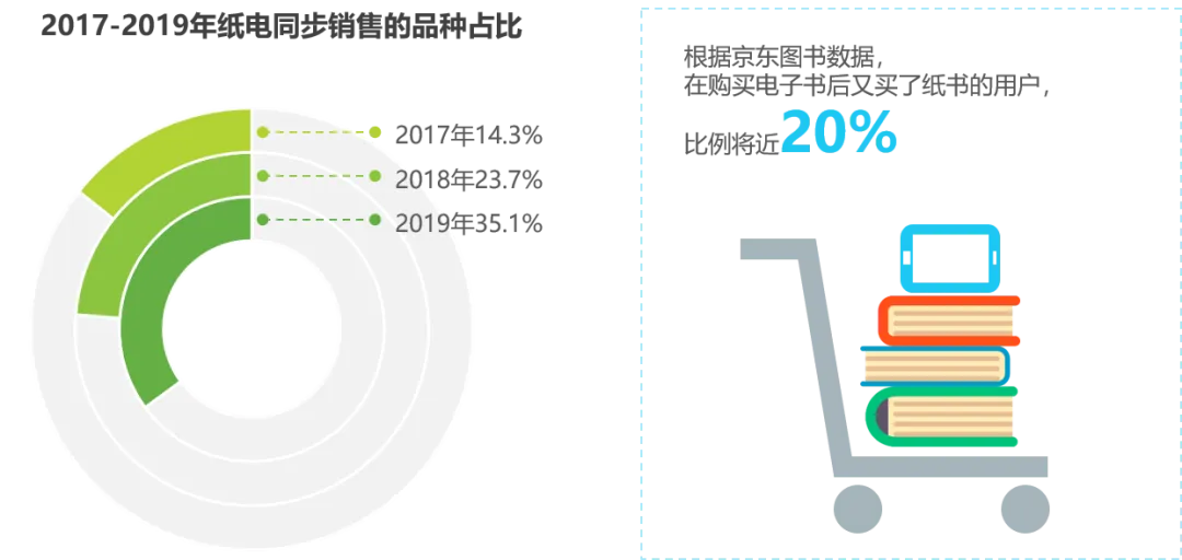 报告显示,一本书同时有纸书和电子书两个出版形式变得越来越普遍,“纸电同步”销售的品种占比越来越高:从2017年的14.3%,到2018年的23.7%,到2019年已经超过35%。同时,有近20%的用户,在购买电子书后又买了纸质书。