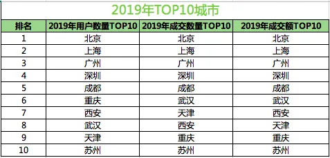 根据报告数据,在2019年无论是用户数量,还是成交数量和成交额,北京、上海、广州、深圳、成都五座城市都排在前列。