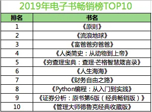 2019年电子书畅销榜TOP10中,以经典金融理财类书籍、管理类以及计算机类工具书籍为主。其中经典金融理财类书籍占四席,《富爸爸穷爸爸》《穷查理宝典》《财务自由之路》和《证券分析》纷纷上榜。《原则》连续两年蝉联榜首,也是唯一一种同入2019年纸书、电子书双榜前十的图书。