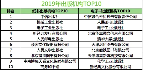 2019年纸书出版机构TOP10中,中信出版社和机械工业出版社与2018年排名一样,位居榜单第一和第二名。2018年排名第四的电子工业出版社今年排名上升一位,进入前三。读客文化股份有限公司2019年新晋入榜。机械工业出版社、电子工业出版社、人民邮电出版社均属于科技大社。随着AI、5G、区块链、VR、智能家居等科技领域日益受到关注,科技类图书市场将不断扩大。