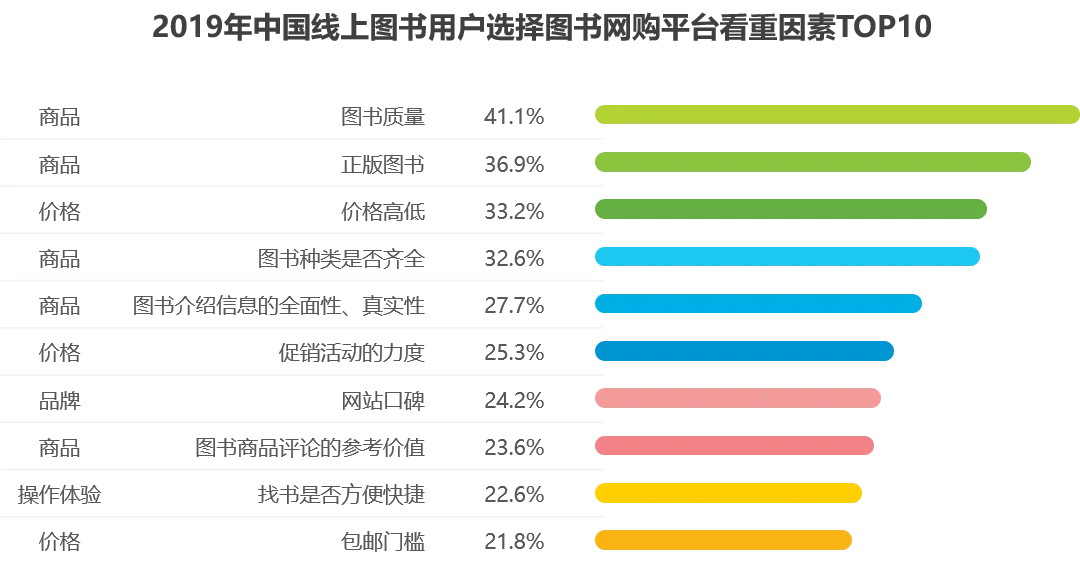 根据报告内容,线上图书用户中,相对价格,用户更看重平台、品牌、服务:46.0%的用户认为某些平台、品牌的品质和服务更好,价格贵点也没关系,44.8%的用户愿意为更好的服务支付更多的金钱。在用户选择图书网购平台的看重因素前十项中,图书质量是用户最看重的,占比41.1%;此外,36.9%的用户看重正版图书,33.2%的用户看重价格高低;32.6%的用户看重图书种类是否齐全。这要求线上图书平台既要做好选品和质量把控,又要尽可能地给消费者让利。京东图书之所以获得读者的广泛认可,与多年来不断深耕细作有直接关系。