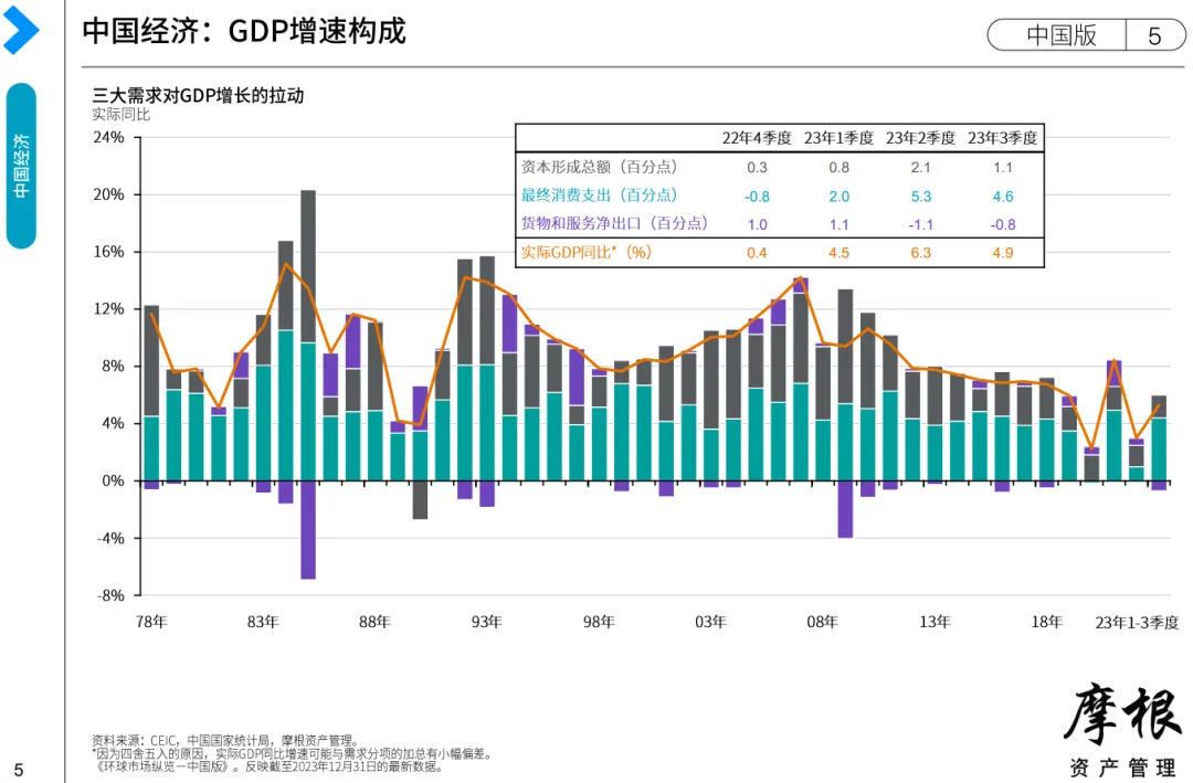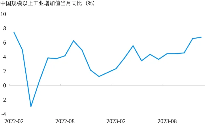 中国主要经济指标于2023年末最后几个月呈现企稳迹象。国家统计局上周披露数据显示,中国2023年GDP增长5.2%。其中,第四季度GDP同比增长5.2%,高于前值4.9%,但原因可能主要在于2022年第四季度基数较低。从月度来看,固定资产投资和工业生产数据表明政策刺激举措产生了一定的积极影响,12月规模以上工业增加值同比6.8%,增速创22个月新高。