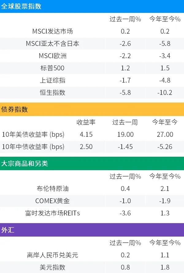 继12月通胀数据超预期后,上周公布的美国12月零售销售增幅再超预期,显示美国经济以坚实步伐迈入新的一年。叠加部分美联储官员的讲话降低了市场对降息的预期,上周美元、美债收益率出现大幅反弹,但软着陆预期增强背景下,美股表现仍然相对稳固,纳斯达克指数和标普500指数全周上涨2.3%和1.2%。