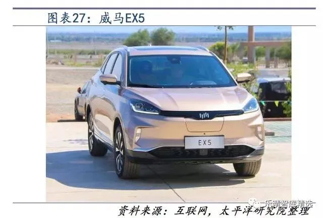 威马、小鹏亲民路线。威马EX5于18年4月上市,补贴后售价9.9万起,目前处于产能爬坡阶段。EX5定位A级SUV,工况续航300~460公里。