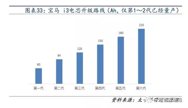 宝马i3搭载的三星供应的方向电芯,在电芯尺寸不变的情况下,电芯的容量由第一代车的60Ah提高到第三代车的120Ah,电芯容量翻了一倍,电池包容量和续航里程均提高了~90%。