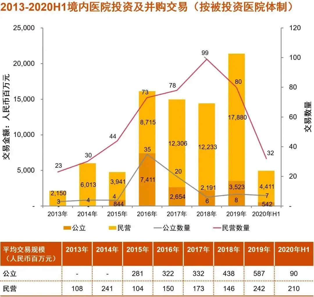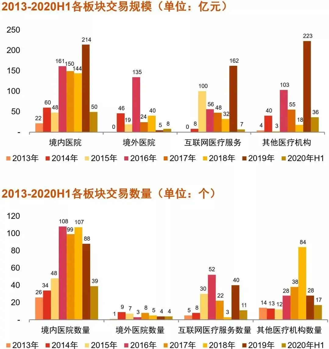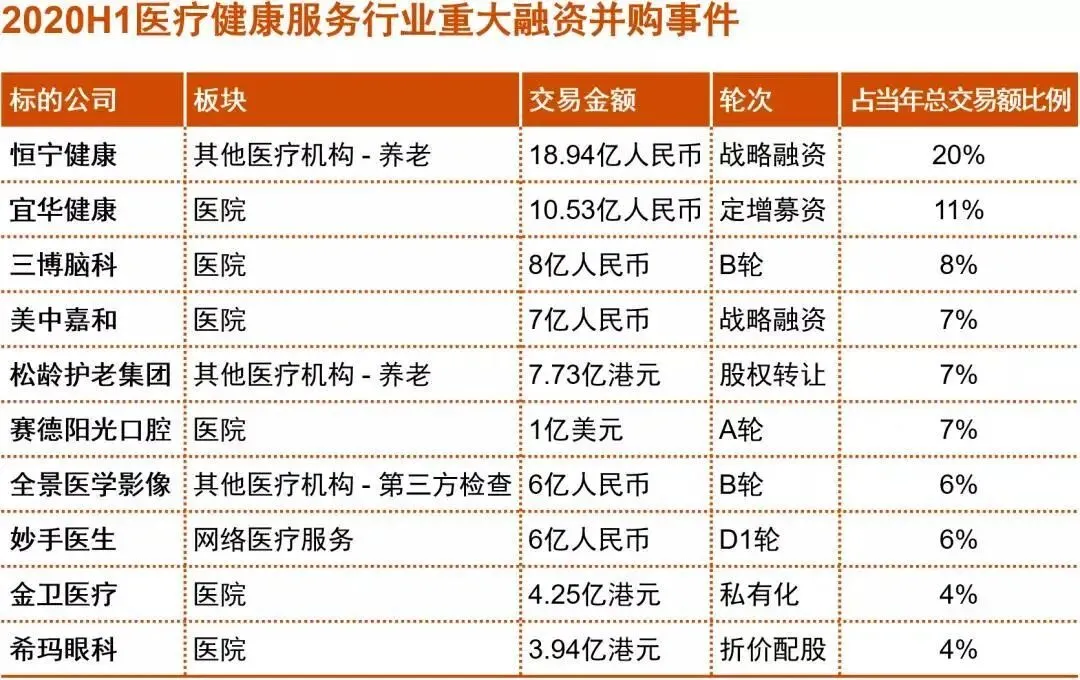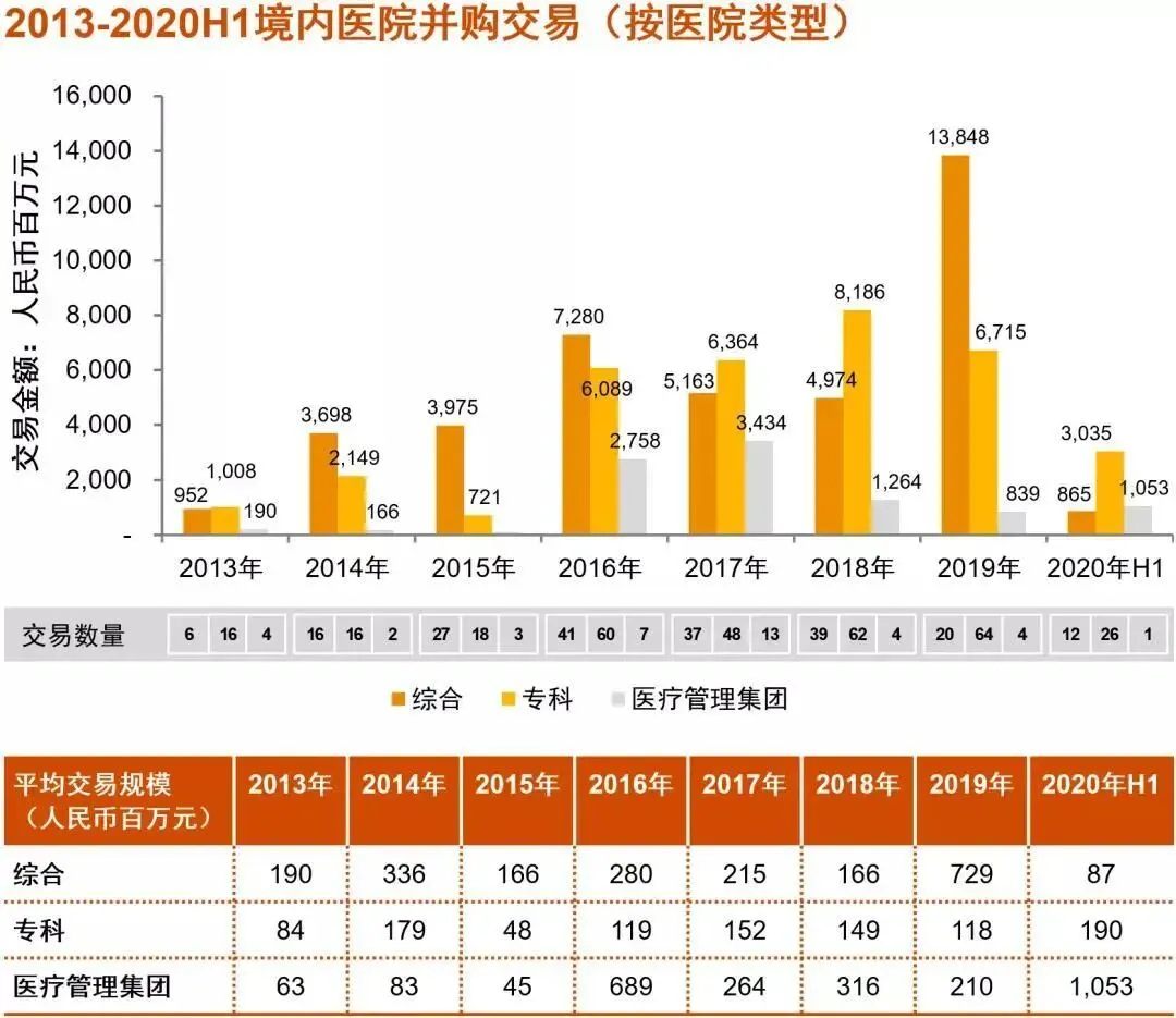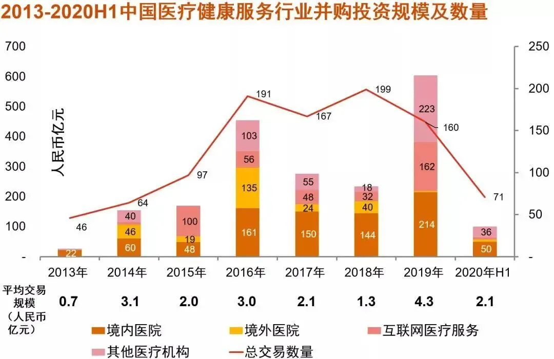 2020年上半年,大型整合交易规模整体下降,超十亿并购事件仅两起,资金主要向医院及养老机构聚集。