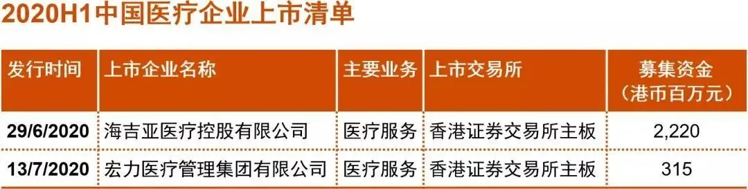 2020年上半年有两家中国医疗服务提供商于香港证券交易所上市,海吉亚是国内领先的民营肿瘤医疗集团,经营或管理10家以肿瘤科为核心的医院网络。另一家上市的宏力医疗是河南领先的民营综合医院。两家上市企业均为县域医疗等下沉市场孵化的民营医疗集团。在一、二线城市医疗竞争环境逐渐激烈的情况下,民营医疗资源在万亿级下沉市场中的活力逐渐释放,对公立医疗的补充作用愈加重要。在美股中概股回归,A股市场降低红筹企业回归门槛的背景下,预计未来会有更多中国医疗企业于港股或A股上市。