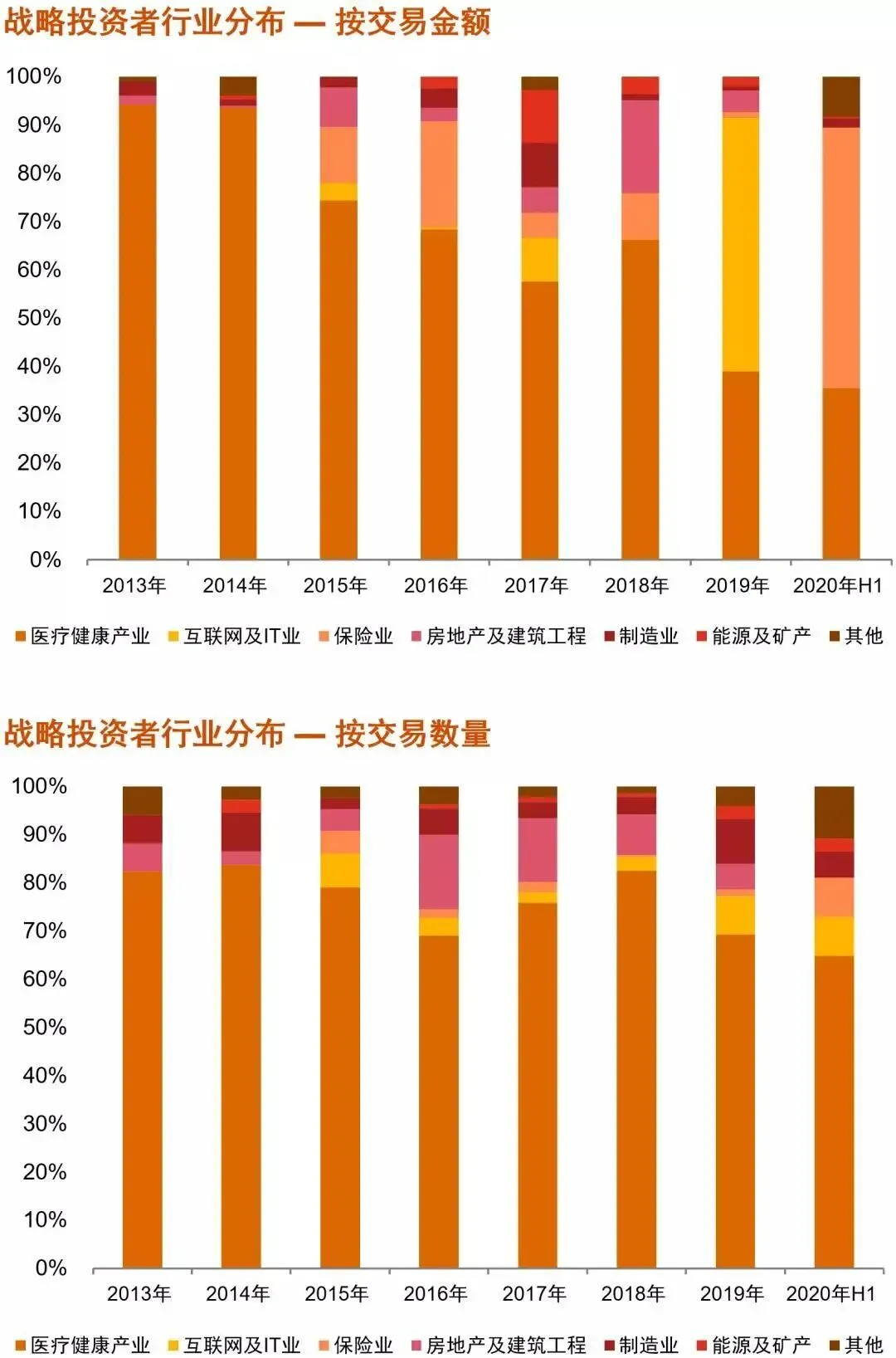 疫情助推下,医疗健康服务行业逆周期特点凸显,更多的产业投资者希望借助跨界转型寻求新的业务增长点。非医疗健康产业的战略投资人参与并购活动交易金额占比从2013年的6%提升至2020H1的64%,交易数量占比相应从18%提升至35%。2020年上半年,在保险业及其他产业投资者主导的并购交易带动下,非医疗健康产业的战略投资人在交易金额和交易数量占比在2019年基础上进一步提高4%。