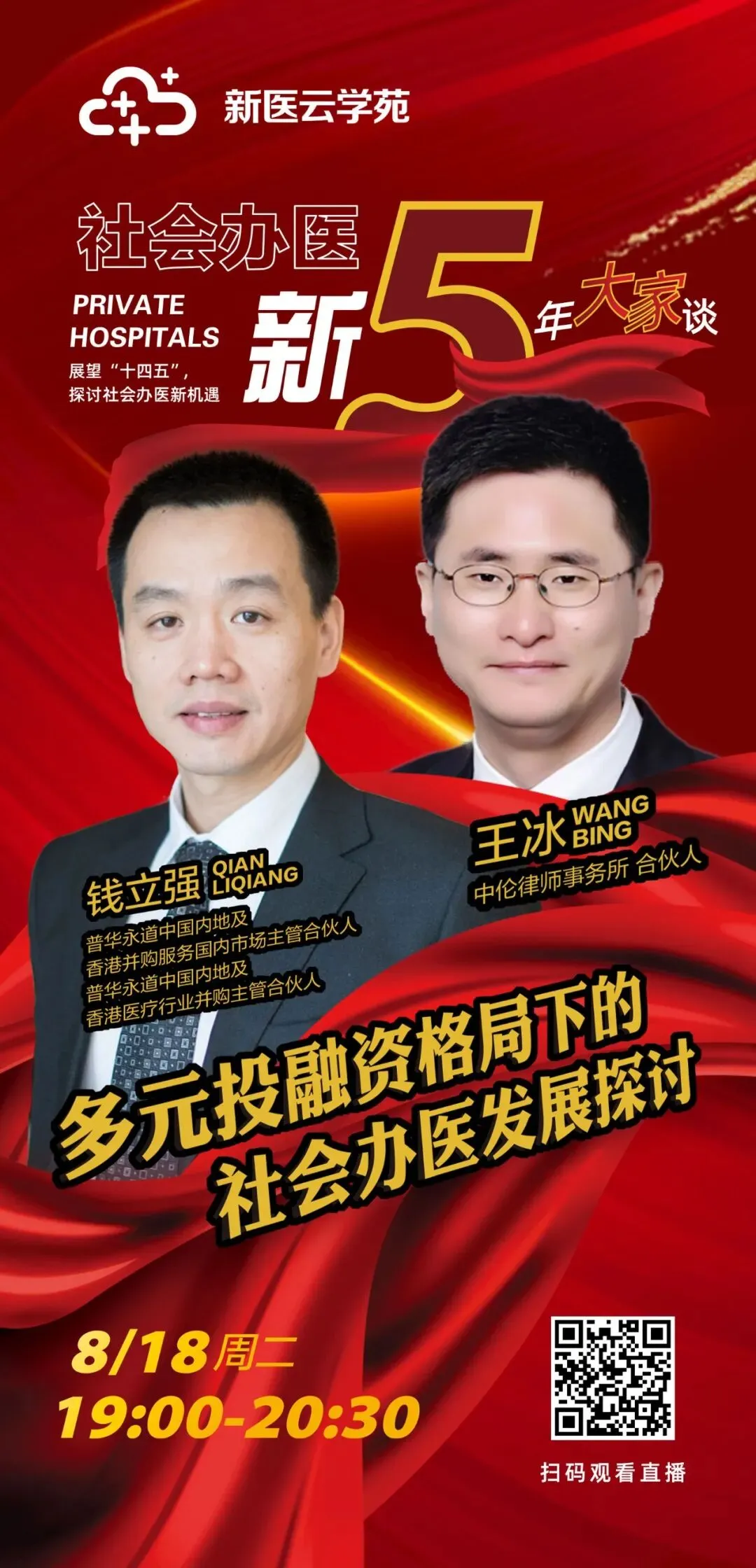 8月18日(周二)晚7点,普华永道中国内地及香港并购服务国内市场主管合伙人,普华永道中国内地及香港医疗行业并购主管合伙人钱立强和中伦律师事务所合伙人王冰将分析近年来我国医院投资趋势,并结合新冠疫情在全球的影响,探究未来行业投资趋势,敬请期待。