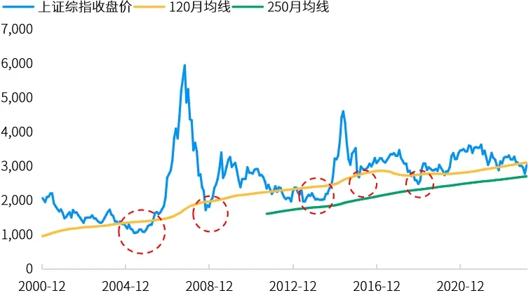 上周大盘以行业轮动的方式展开了调整,即先涨的行业(如中字头、红利等)先调整,前期涨幅落后的地产、消费(伴随国债期货明显回调)和医药板块等补涨,直到周五尾盘将周涨幅回正。尽管走势多少有“斧凿”之痕,但更重要的是区分,哪些行业是超跌反弹性质的反弹,哪些是借着大盘的回调需求顺势而为,宏观环境是否有发生质的变化对于判断至关重要。短期上证综指仍然可能测试半年线的支撑力度,但不管本轮行情是反弹还是反转,或都有触碰120月均线的诉求,至于能否有些突破,取决于基本面复苏的强度和持续性。就当前可预见的宏观趋势而言,在未来较长的时间里心态上“在市场乐观时多一份清醒,在市场悲观时多一点乐观”,着眼于中长期结构性增长机会,与优质公司为伍,或是较好的投资策略。资料来源:万得;(上)触底日期为2月5日,统计数据包含当日,申万一级行业;(下)数据区间2000.11-2024.03,120月均线的数据起始于2000.11,250月均线数据起始于2011.09。