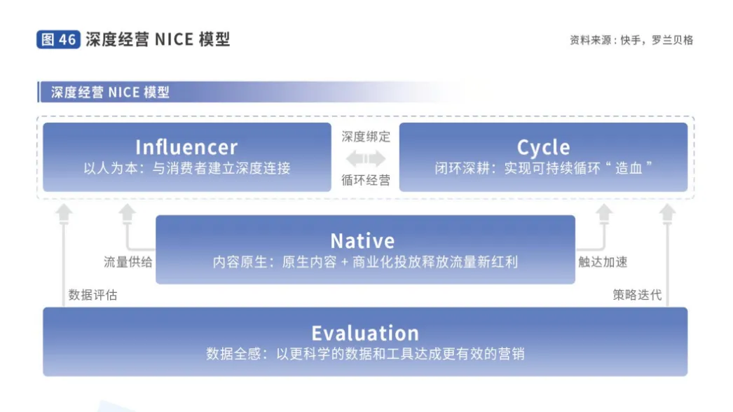 在新市井商业的理念下,报告此次提出的“NICE深度经营模型”就给出了在快手上做经营的应对之法,模型主要围绕4个关键词构建,分别是以人为本(Influencer)、闭环深耕(Cycle)、内容原生(Native)以及数据全感(Evaluation)。