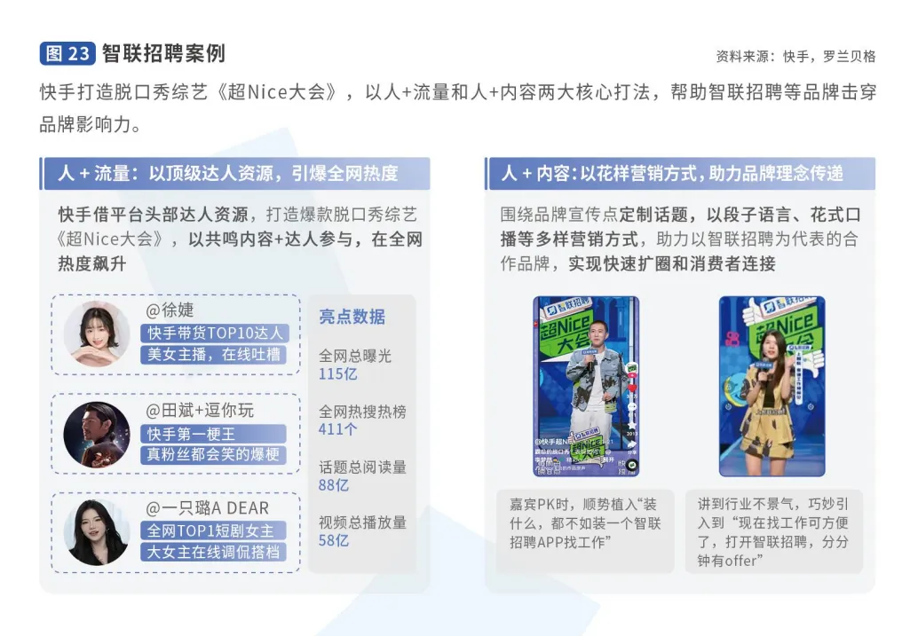 在IP势能放大方面,快手与笑果文化打造脱口秀直播综艺《超NICE大会》聚焦社会议题,投入顶级达人和流量资源,帮助智联招聘等品牌方激活粉丝经济。