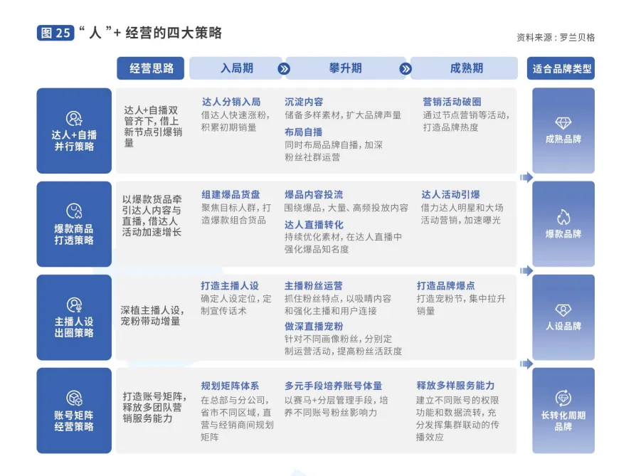 而从另一视角出发,针对达人商家成长之路的不同阶段,报告也分别进行了区分。在入局期,开直播、建阵地、涨粉丝是标准动作,无需纠结于如何展开复杂的营销玩法,而是需要围绕自身特色建立人设打好基础,组建货盘和直播阵地。