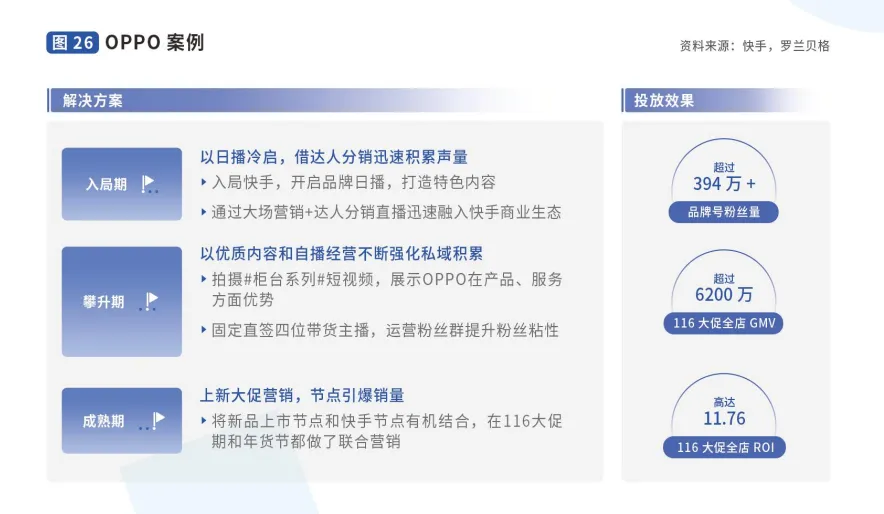 举例而言,OPPO作为领先3C品牌2021年上半年开始在快手运营。在入局期,OPPO一方面开启品牌日播打造特色内容,另一方面通过大场营销+达人分销直播迅速融入快手生态;在攀升期,OPPO一方面拍摄系列短视频加强内容建设,另一方面直签四位带货主播并运营粉丝群提升粉丝粘性;在成熟期,OPPO将新品上市节点和快手节点有机结合,在116大促期和年货节都做了联合营销。