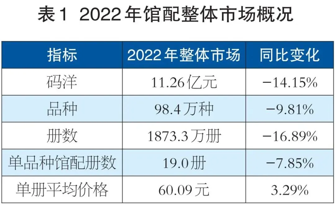 根据武汉卷藏·中文图书馆藏分析系统统计,2022年1400所图书馆中参与馆配的中文图书品种为98.4万种,合计1873.3万册,单品种馆配册数为19.0册,码洋累计11.26亿。与2021年相比,码洋总额下降14.15%,馆配册数同比减少16.89%,馆配品种数同比减少9.81%。2022年参与馆配的图书单册平均价格为60.09元,较2021年上涨3.29%。(见表1)