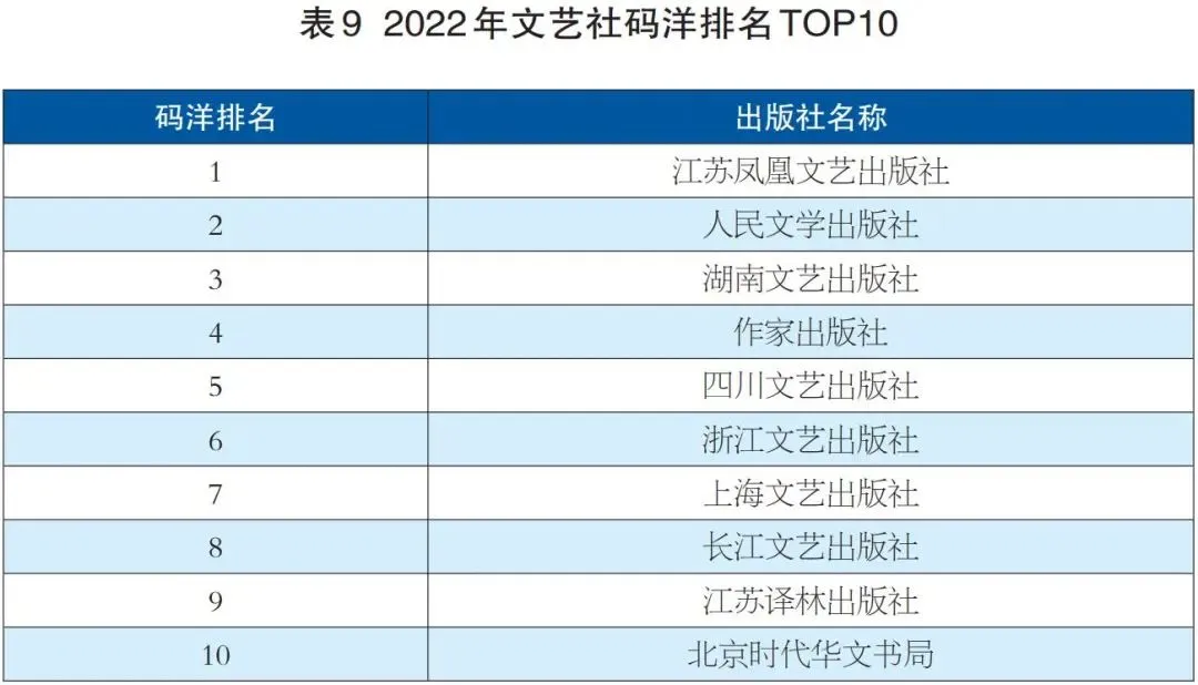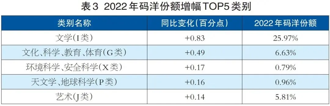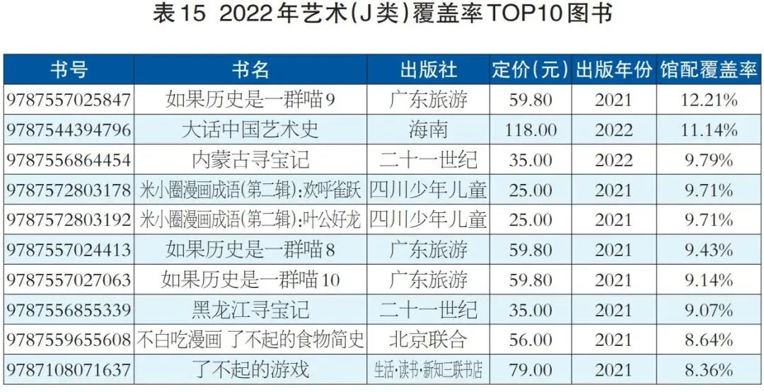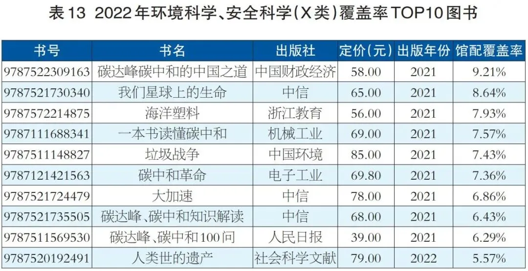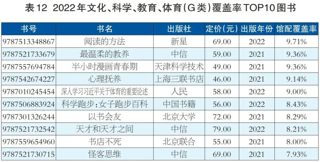 2022年全年馆配市场码洋增幅TOP5类别畅销榜同时发布,分别是文学(I类),文化、科学、教育、体育(G类),环境科学、安全科学(X类),天文学、地球科学(P类),艺术(J类)。(见表11~表15)