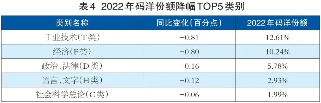 2022年参与馆配的22大类图书中,文学(I类)图书以26.80%的市场份额居首,较2021年增长0.83个百分点,在22大类中增幅最大;同比降幅最大的是工业技术(T类),码洋份额为11.80%,同比下降0.81个百分点。从社科(A-K类)和自科(N-X类)角度来看,本年度参与馆配的社科类图书码洋份额合计74.87%,同比增长0.37个百分点,自科类图书码洋份额为23.54%,同比下降0.32个百分点。(见表3、表4)