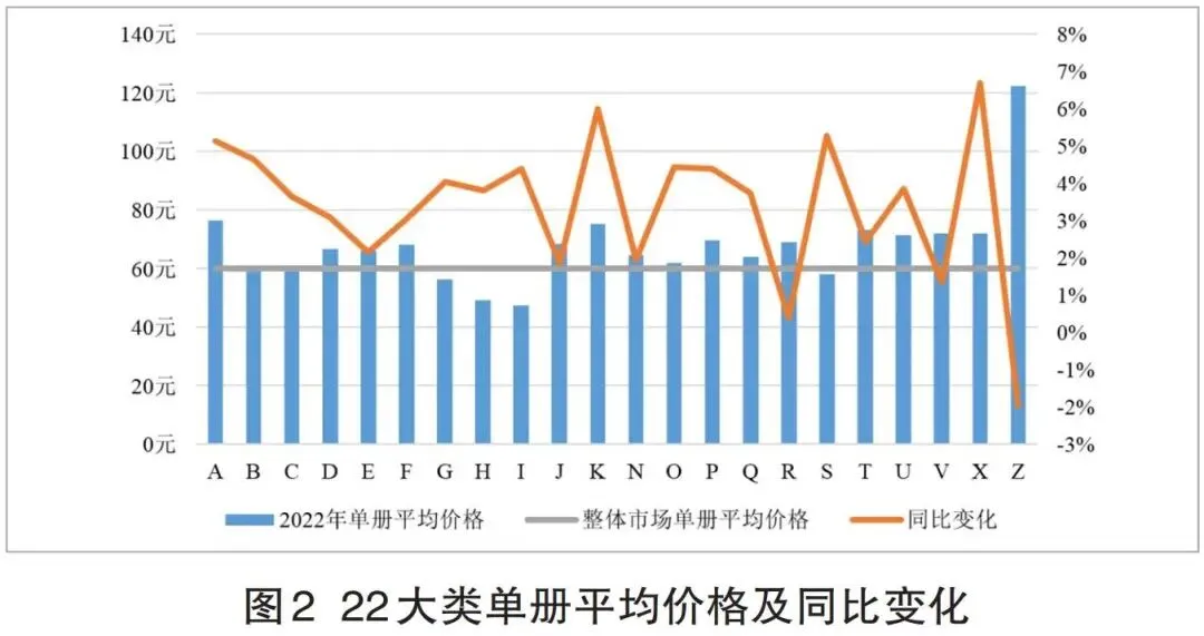 2022年整体馆配市场的单册平均价格为60.09元,细分至22大类可知,单册平均价格不及整体馆配市场的类别共5个,其中相对较低的是文学(I类)的47.32元;其他17个类别中,综合性图书(Z类)以122.43元居首,其次是马列毛邓(A类)的76.53元。与2021年相比,除Z类外,2022年参与馆配的其他类别图书单册平均价格均呈现增长状态,其中环境科学、安全科学(X类)以6.69%的增幅居首,其次是历史、地理(K类),增幅为6.00%。(见图2)