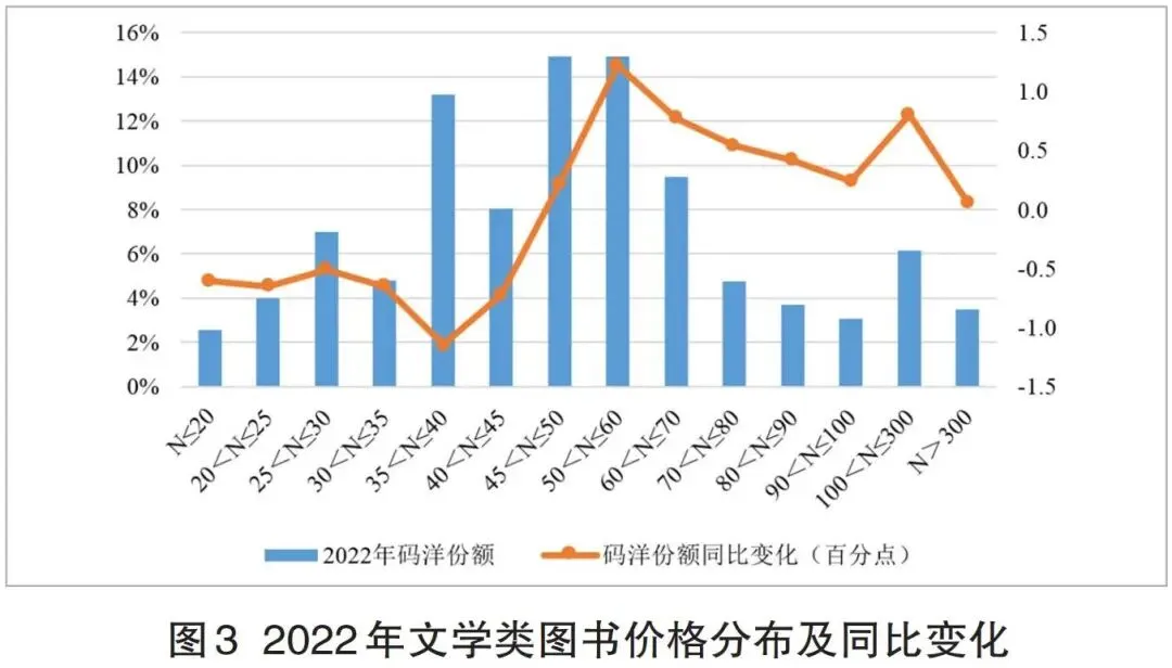 2022年参与馆配的文学(I类)图书单册平均价格为47.32元/册,与2021年相比上涨4.39%。细分至各区间可知,I类图书码洋主要集中在35~70元(含)价格区间内,码洋合计占到I类图书总码洋的60.50%。与2021年相比,定价在45元及以下的细分区间码洋份额均出现不同程度的下降,其中降幅最大的是35~40元(含)区间,同比下降1.14个百分点;45元及以上各个增长区间中,增幅最大的是50~60元(含)区间,同比增长1.22个百分点。(见图3)