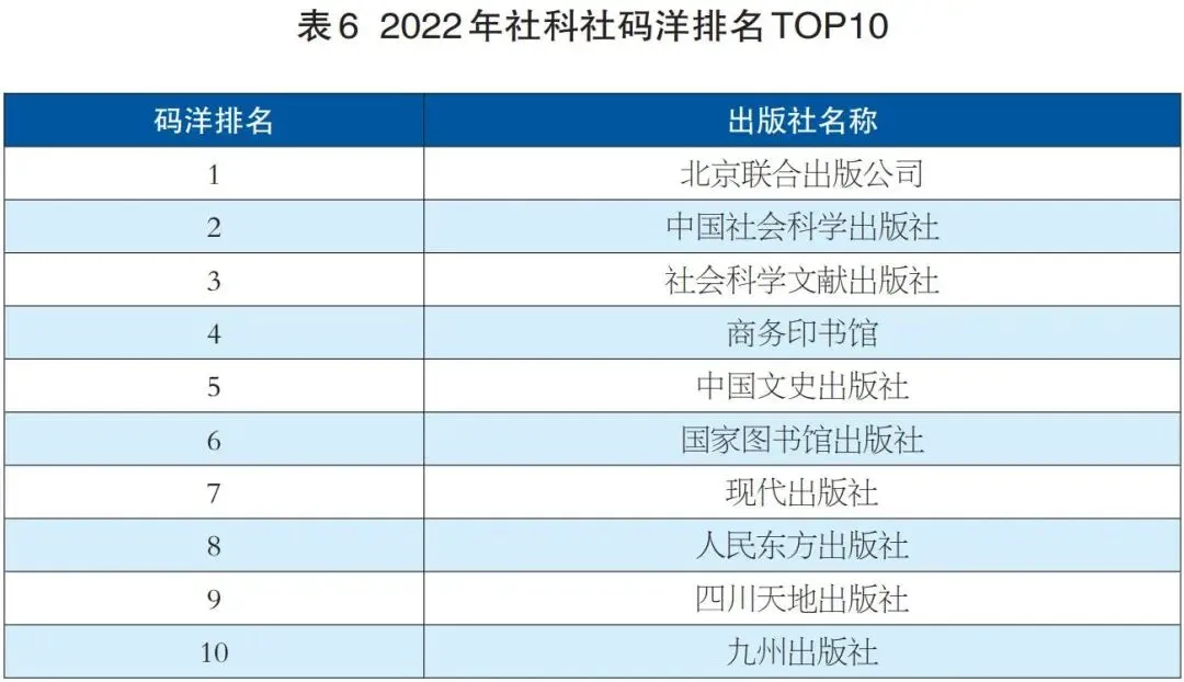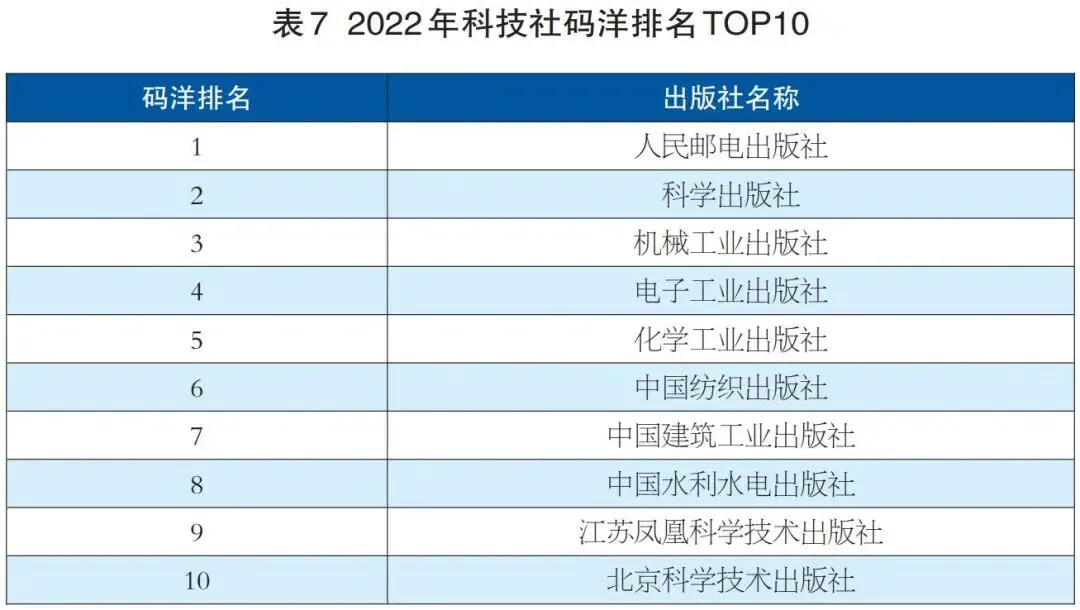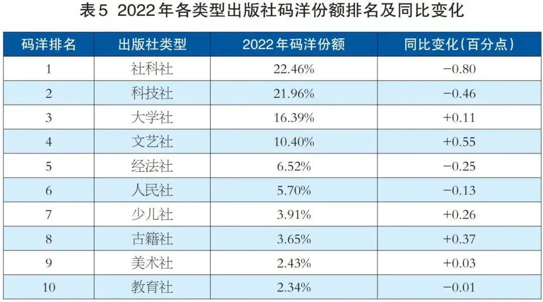 2022年馆配市场竞争格局中,码洋排名TOP20出版社的市场份额合计为29.89%,与2021年TOP20出版社相比,下降1.84个百分点。在参与馆配的各类型出版社中,社科社和科技社分别以 22.46%、21.96%排名前两位,与2021年相比,二者码洋份额均有下降,降幅依次为0.80个百分点、0.46个百分点。TOP10类型中增幅前两位的依次为文艺社、古籍社,码洋份额依次同比增长0.55、0.37个百分点。(见表5~表10)