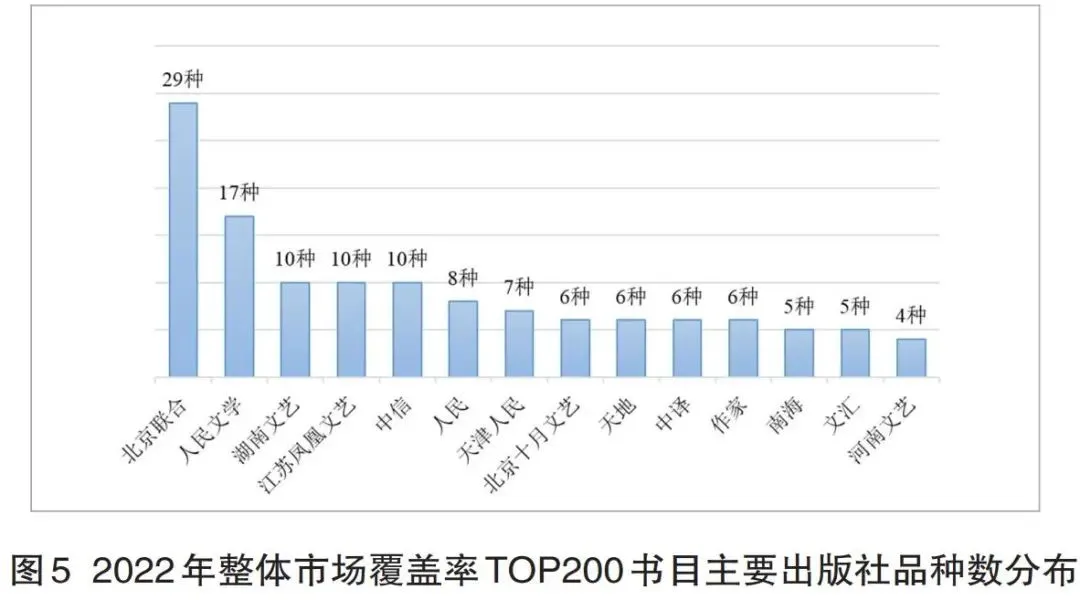 从出版社角度进行统计可知,TOP200书目共涉及61家出版社,其中北京联合出版公司以29种排名居首,其次是人民文学出版社,品种合计17种。上榜图书品种数在4种及以上的出版社共14家。(见图5)