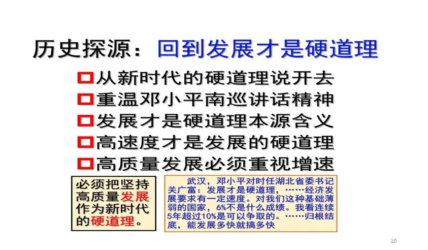 新时代做好经济工作的规律性认识,强调的“五大必须”,第一,必须把坚持高质量发展作为新时代的硬道理,强调了两大关键词,一个是高质量发展,另一个是新时代的硬道理。去掉定语,就变成了“发展是硬道理”。