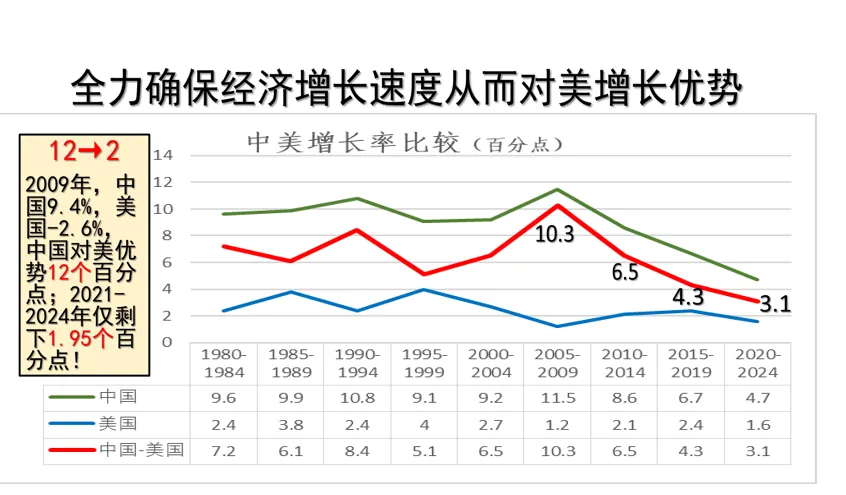 2009年全球经济由于金融危机都总体上出现了负增长。美国作为那次金融危机的重灾区,2009年美国的负增长2.6%,而中国由于4万亿的强刺激,促使中国经济在2009年居然还保持了正增长9.4%。这就意味着中国相对于美国增长速度一年就达到了12个百分点的优势。