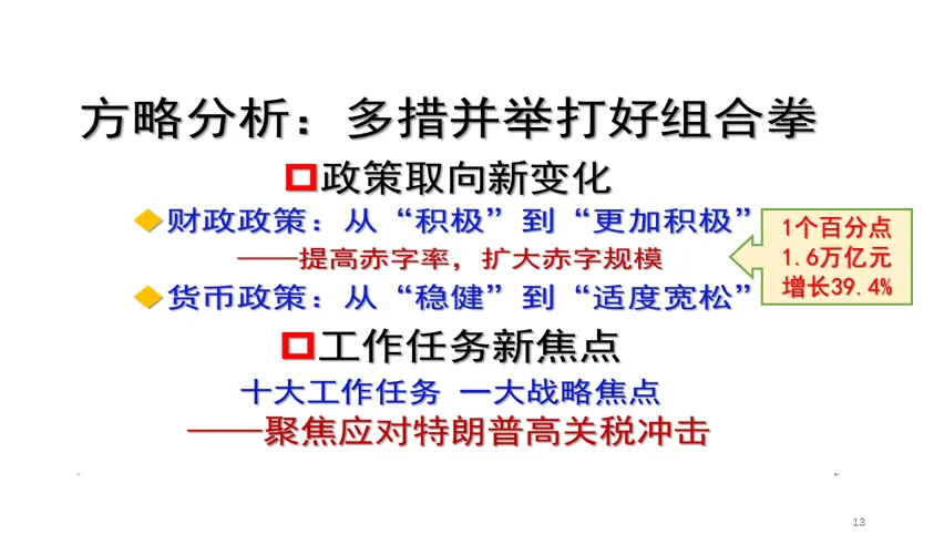 无论在财政政策还是在货币政策上都有实质性的变化,财政政策的变化就是从积极的财政政策转向更加积极的财政政策,“更加”两个字,可不是表面文章、数字游戏、文字游戏,它有实实在在的真金白银,把赤字率由3%上升到4%,仅仅是一个百分点,使得赤字规模扩大了1.6万亿元人民币,比上一年由此就增长了将近40%。