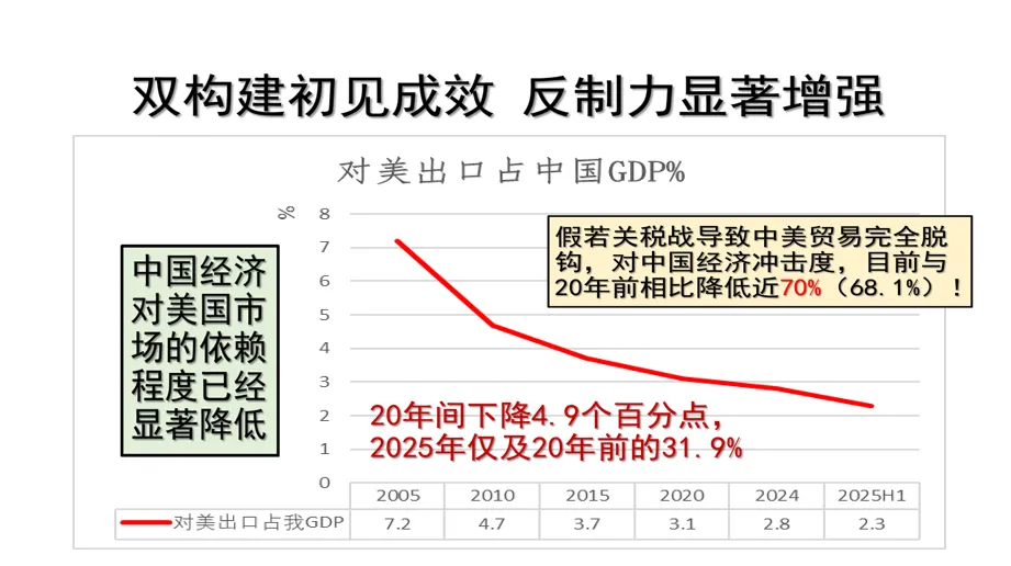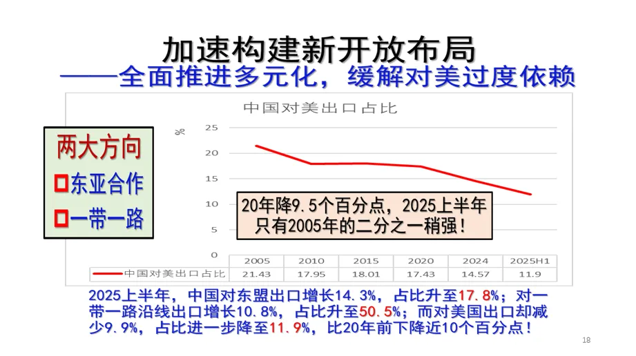 我们再看第二条红色的曲线,总出口当中对美国的出口所占比重的变化,这个比重在2005年高达21.43%,我们的出口1/5以上靠美国。显而易见,对美国的依赖程度太高太重。必须通过构建新发展格局,尤其是全面推进多元化,降低对美国市场过高过重的依赖。